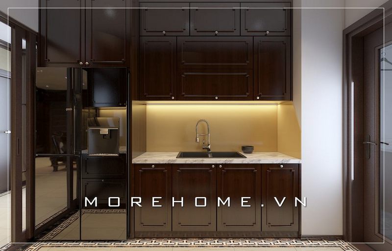 . Tone màu trầm từ gỗ tự nhiên được sử dụng để thiết kế nội thất phòng bếp, tạo ra một cảm giác sang trọng và hút hồn.